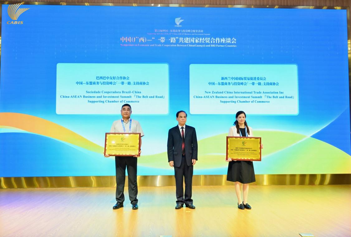 会议举行了“中国—东盟商务与投资峰会支持商协会授牌仪式”,中国—东盟商务与投资峰会秘书处分别授予新西兰中国国际贸易促进委员会、巴西巴中友好合作协会“峰会‘一带一路’支持商协会”牌匾,以此鼓励更多的海外商协会支持峰会,据悉,目前受此殊荣的国外商协会仅达4家。